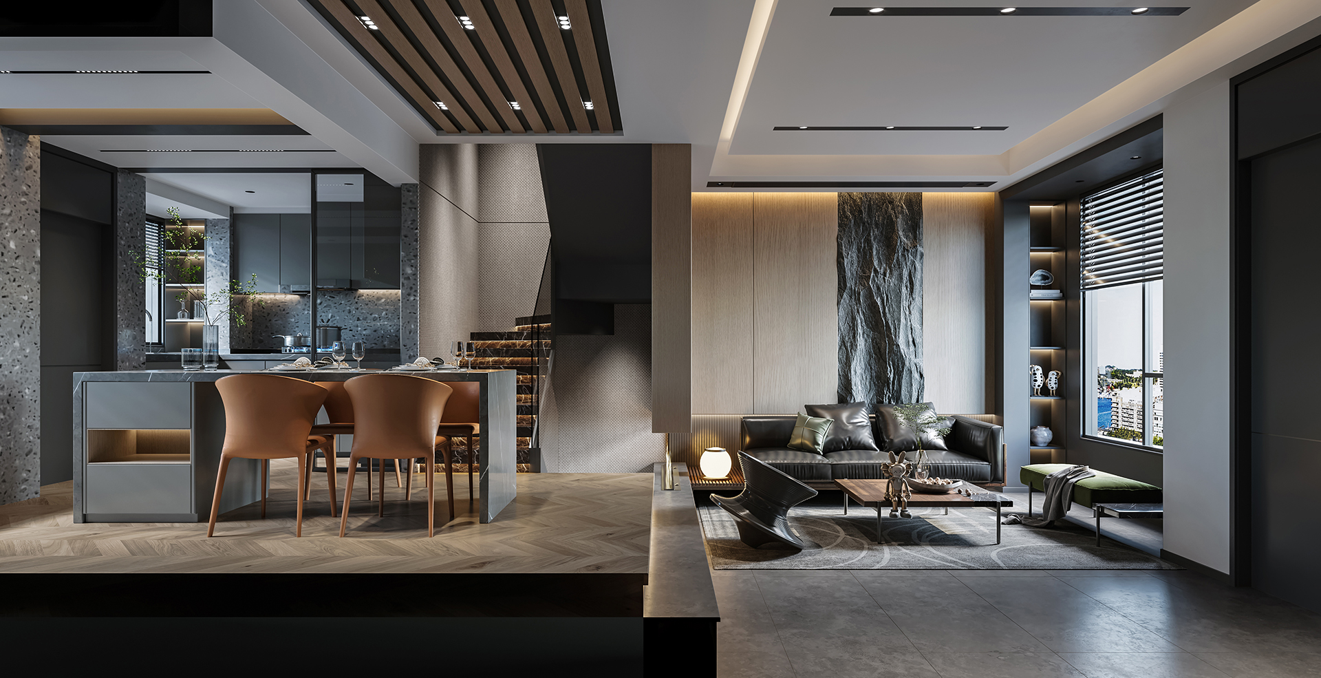 → 石头+原木背景墙,上设置暗藏灯带,旁边黑色哑光质感墙板,夜晚光影层次直接拉满